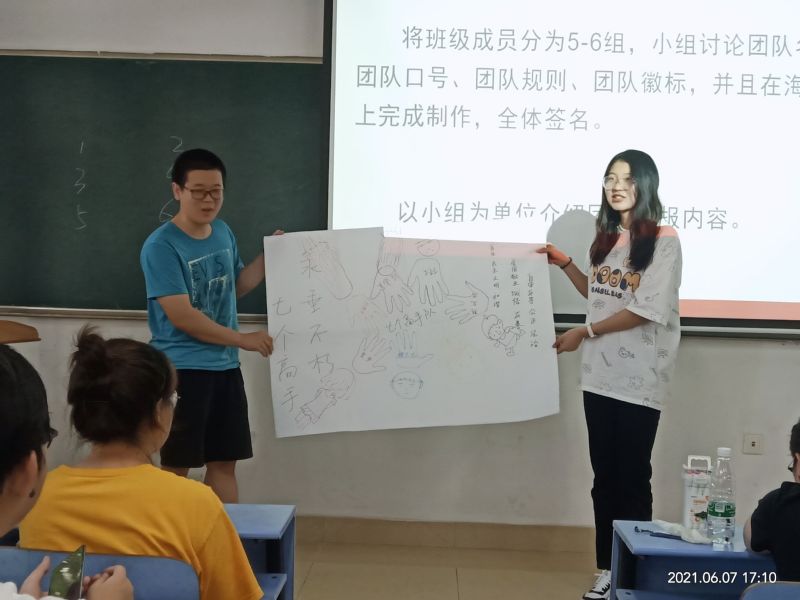 团队相识环节,各组同学结合实际围绕“团队名称、团队口号、团队规则和团队徽标”等进行设计和展示,体悟团队协助过程中的责任意识和合作意识。