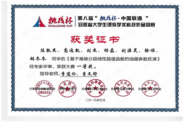 5月25日-27日,由共青团安徽省委员会、安徽省教育厅、安徽省科学技术协会等单位共同主办,我校承办的第八届“挑战杯·中国联通”安徽省大学生课外学术科技作品竞赛在翡翠湖校区成功举行。我院由李道伦、查文舒两位老师指导,陈凯杰(2015级)、高逸凯(2016级)、刘杰(2016级)、杨磊(2017级)、刘源昊(2017级)、徐顺(2015级)和胡冬冬(2015级)7位本科生的作品《基于高维分段线性插值函数的油藏参数反演》(自然科学类学术论文类)荣获一等奖,这是我院师生首次组队参加该项赛事,同时也实现了一等奖的历史性突破。
