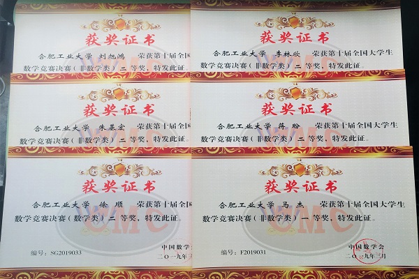 中国数学会自2009年起每年举办一届“全国大学生数学竞赛”,竞赛分为预赛与决赛两个阶段,预赛在每年秋季学期开展,决赛在每年春季三月份开展。参赛对象为大学本科二年级及二年级以上的在校大学生,按照专业不同划分为数学专业和非数学专业两大类;数学专业又分为低年级组和高年级组两个级别。第十届全国大学生数学竞赛初赛报名人数138832人,参赛高校包括北大、清华等共784所。决赛共有203所高校的525名学生参加,最终评出非数学组一等奖63名,二等奖98名,三等奖137名,数学专业组一等奖46名,二等奖64名,三等奖82名。本次比赛中,中国数学会分配给安徽赛区非数学专业组9个决赛名额,根据预赛成绩我校斩获6个名额,数学专业也首次获得1个决赛名额。这7名同学在决赛中取得1个一等奖和6个二等奖的优异成绩!