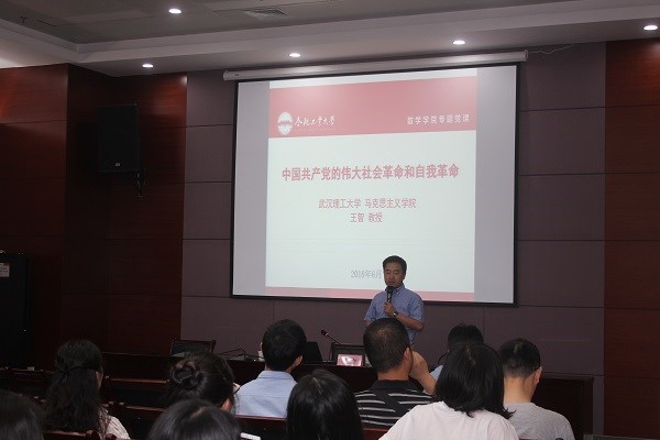 6月3日,武汉理工大学马克思主义学院副院长、教授、博士生导师,湖北省统一战线理论与实践研究基地主任,马克思主义理论一级学科博士点学科带头人王智教授应邀来我院做了题为《中国共产党的伟大社会革命和自我革命》的主题报告。学院教师党员代表,全体研究生、本科生党员、发展对象和分党校第4期入党积极分子班全体学员参加此次报告会,报告会由数学学院党委书记方留主持。