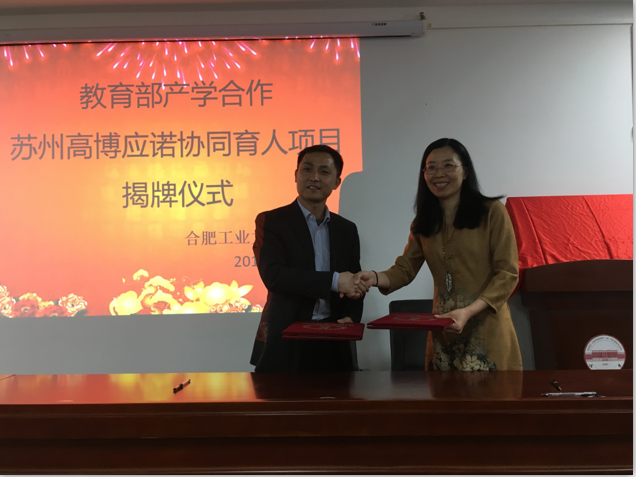 在揭牌仪式上, 我院与苏州高博应诺信息科技有限公司签订了协同育人项目合作协议。双方就目前在多元复合型人才培养中迫切需要的理科背景、实践项目开发、基地建设等问题进行了深入细致的交流,确立了“资源共享、优势互补、合作共赢”的共同发展目标,发挥教育合力, 提升人才培养质量。揭牌仪式由我院张莉副院长主持,王青山副院长和周世峰总经理分别代表双方发表了讲话,他们共同强调了产学合作的必要性和可行性,讨论了目前合作模式的优缺点,并就下一步继续深化合作提出了若干意见和建议。最后,我院殷明教授做了总结讲话,殷明教授是我院产学合作工作的发起者之一,多年以来一直积极推动协同育人事业的发展。殷明教授先是肯定了双方近十年以来在产学合作上取得的成果,并寄语希望双方共同努力,把产学合作协同育人事业提升到一个新的高度。