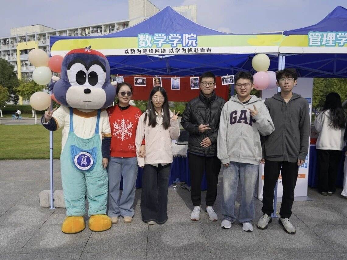 为充分发挥第八届大学生网络文化节的区域引擎作用,2025年10月26日上午,合肥工业大学在翡翠湖校区东风广场举办网络文化节。数学学院以“以数为笔绘网络,以学为帆赴青春”为主题精彩参展,用创意与趣味点亮校园文化盛宴。活动现场,数学学院展台凭借独特设计圈粉无数。展台上方,函数图像、几何图形等抽象数学元素被巧妙转化为搞怪表情包,让枯燥的公式定理变得生动可爱,吸引过往同学纷纷驻足拍照打卡。此外,展台设置的数学趣味答题环节备受青睐,同学们踊跃参与解题闯关,成功挑战者可赢取精美小礼品,在互动中感受数学魅力。“大猩”互动环节更是成为现场亮点,搭建起数字创意与校园文化的沟通桥梁,让同学们在共玩共创中解锁网络文化新体验。