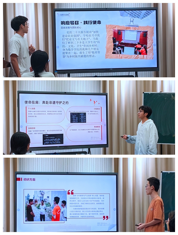 2025年9月22日晚19:30,数学学院于科教楼B座1711开展数学学院开展2025年暑期三下乡社会实践优秀个人及成果答辩工作,本次答辩评委邀请到马克思主义学院团委书记伊斯坎达尔·玉苏谱老师担任嘉宾,数学学院团委书记韩玉洁、2025级本科生新生5人共同担任评委。
