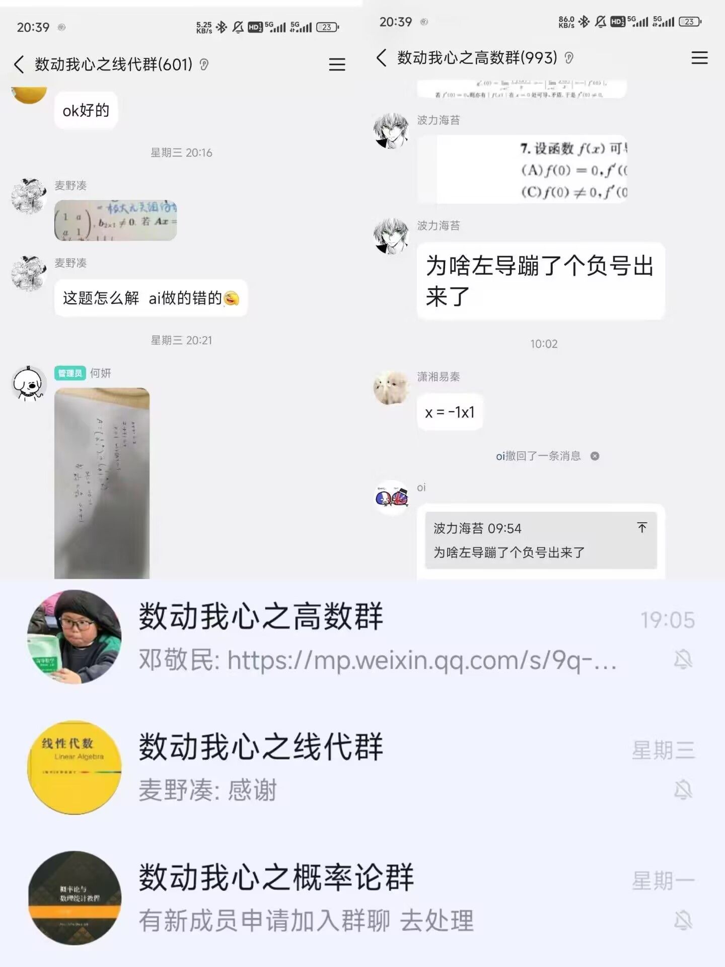 活动开展期间,众多研究生志愿者踊跃参与。他们充分发挥专业优势,以扎实的学识和耐心的态度,为低年级同学答疑解惑。答疑内容重点涵盖高等数学中的函数极限、微分方程,以及线性代数中的矩阵运算、线性方程组等核心难点,并通过文字解析与手写演算相结合的方式进行细致讲解。同学们可随时在群内提问,志愿者不仅逐步拆解题目、阐明思路,还主动分享学习方法与经验。线上形式有效打破了时空限制,使学生无需奔波即可及时解决课堂及练习中遇到的疑难问题。参与学生普遍反映,学长学姐的讲解深入浅出,既帮助其解决了具体问题,也进一步梳理了知识结构,增强了学好数学的信心。
